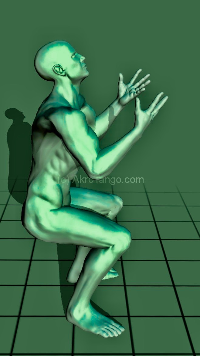 In principle, it is possible to balance the flyer only over the contact point of the thighs. The flyer serves as a counterweight, while the thighs must be as horizontal as possible. The base balances in the interplay of knee and hip joints. With beginners it’s often observed, that those are pulled up on their tiptoes. For a stable balance, however, this should be absolutely avoided.
