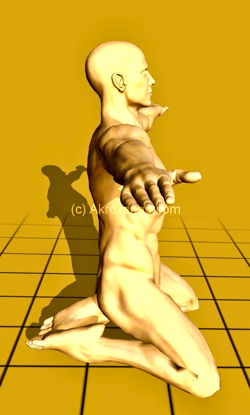 3) Standing on two legs, the flyer holds the heels low and together so that the shin leans against the back of the head and does not slip past it.