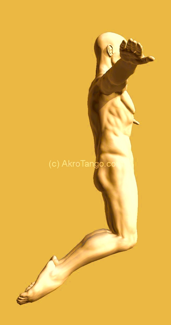 The contacting point on the knee is a test of courage for the flyer. The center of gravity must be (as always) above the contact point, which is just below the knee. This requires a straight hip. It’s not easy to land on your feet when you tilt forward… but the flyer should trust his base, or delete that position from his repertoire.